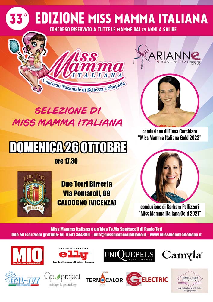 Domenica 26 Ottobre 2025 a Caldogno (Vicenza) selezione valida per la 33a edizione del concorso nazionale di bellezza e simpatia Miss Mamma Italiana. Di seguito la locandina dell’evento: