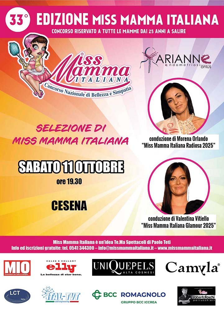 Sabato 11 Ottobre 2025 a Cesena (Forlì-Cesena) selezione valida per la 33a edizione del concorso nazionale di bellezza e simpatia Miss Mamma Italiana. Di seguito la locandina dell’evento: Nella foto sotto le vincitrici della selezione: