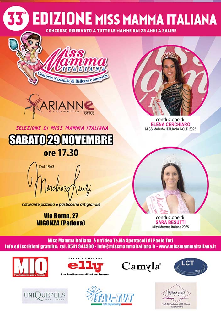Sabato 29 Novembre 2025 a Vigonza (PD) selezione valida per la 33a edizione del concorso nazionale di bellezza e simpatia Miss Mamma Italiana. Di seguito la locandina dell’evento: Nella foto sotto le mamme vincitrici della selezione: